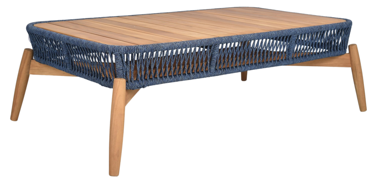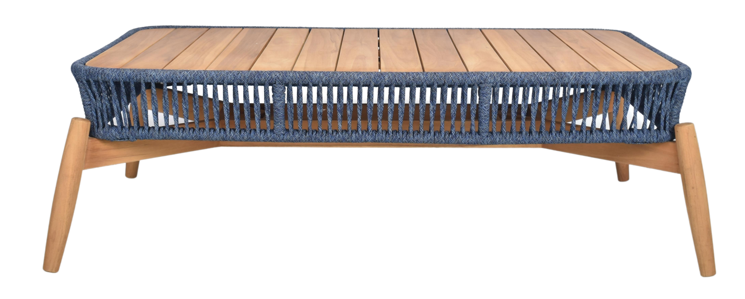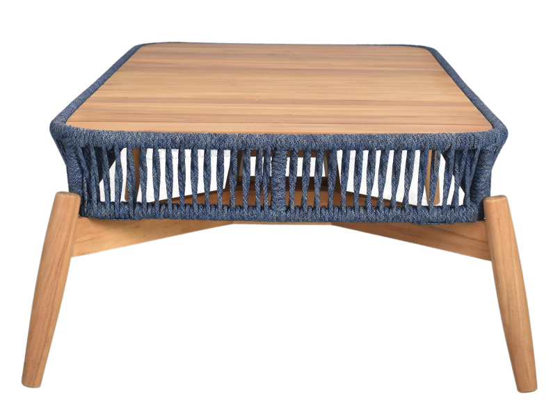 The table’s design is both stylish and functional, with a sturdy aluminium frame providing a stable base for the natural teak wood accents and the intricate outdoor rope weaving. The blue jeans color adds a touch of elegance and sophistication, making this coffee table a true statement piece.