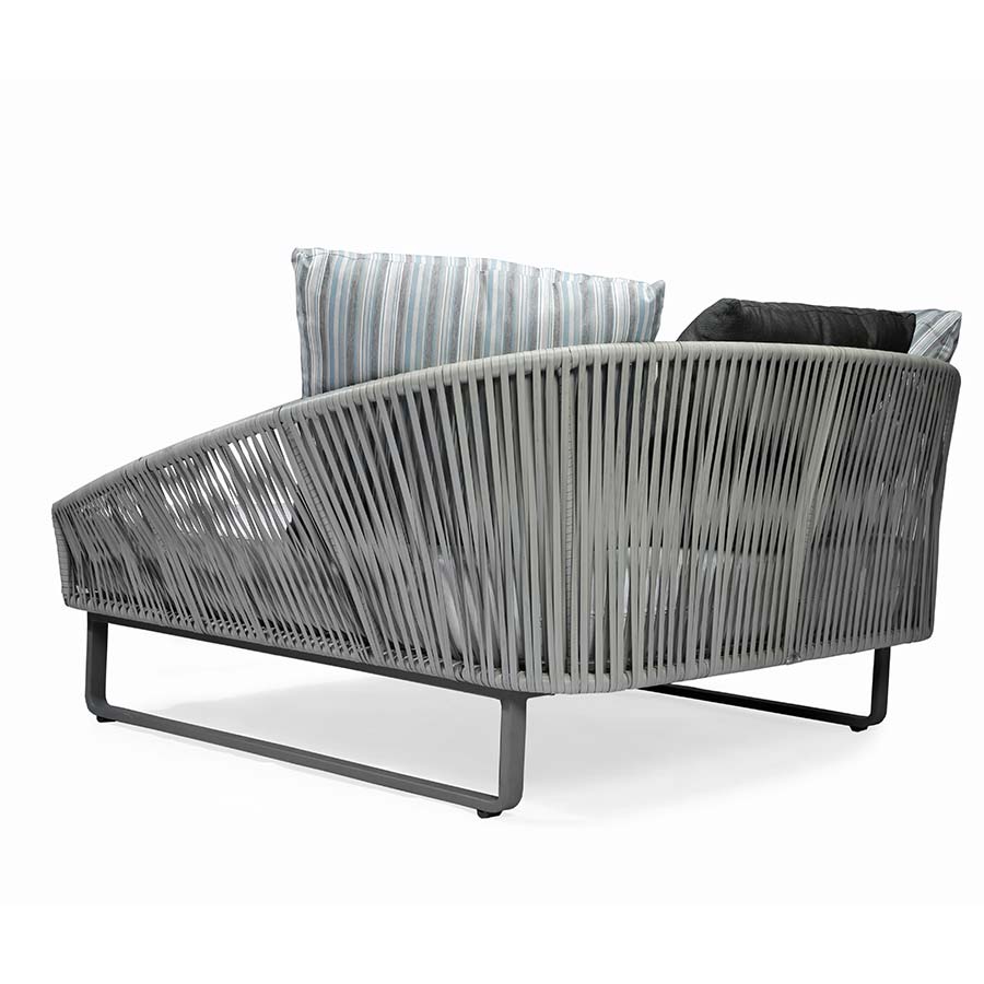 Laupen is distinguished by its use of waterproof materials throughout, including its aluminum frames, chairs with braided polyester and plush cushions, and teak or stone table tops.